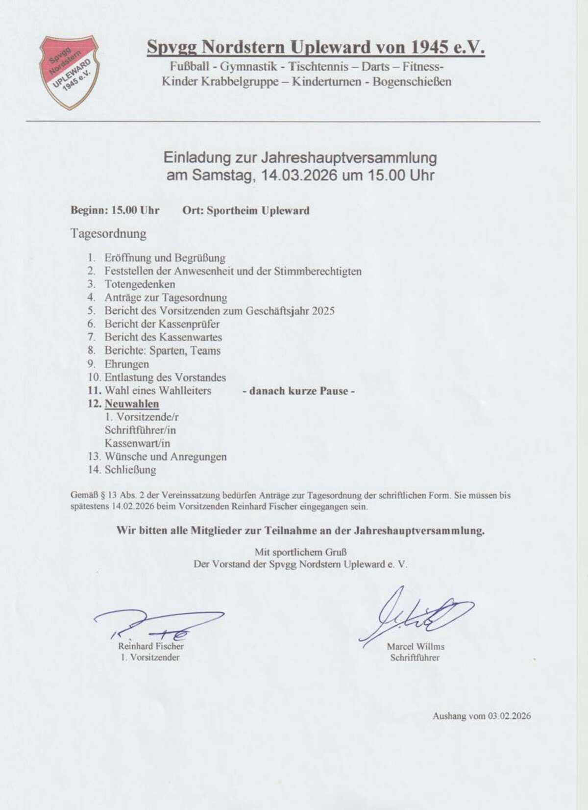 am Samstag, den 14. März 2026 um 15:00 Uhr, findet unsere Jahreshauptversammlung im Sportheim Upleward statt.